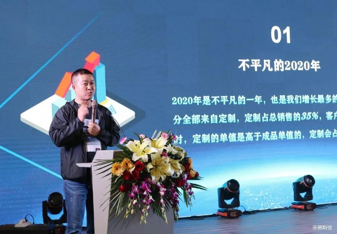 华灯璀璨的开场仪式,点燃了现场如火如荼的气氛。mile米乐集团集团集团营销总经理陈玉伟先生对晚会进行了主题发言,他对2020年的营销工作进行了总结,并着重从营销工作部署、重点项目开展、产品整合、拎包帮扶、渠道运营和移动+定制整装优势等方面对2021年的营销工作做了全面的统筹规划。同时,他还讲解了“美国梦凯莎床垫”新品的产品工艺、市场优势、产品定位,使经销商对我们的新产品拥有更深入的认识和了解。
